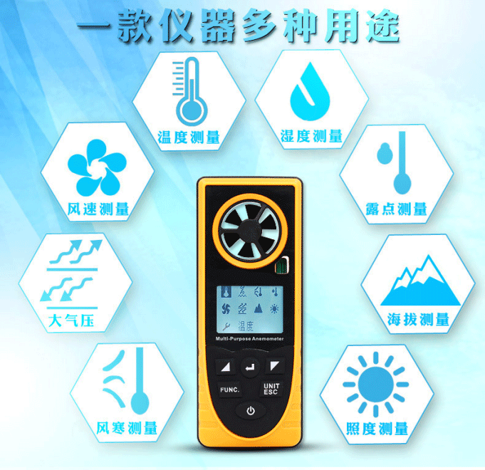 本產(chǎn)品是一款本便攜式多功能氣象儀,適用于測量溫度、濕度、風寒、露點、風速、大氣壓、海拔、照度。