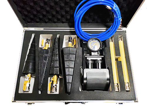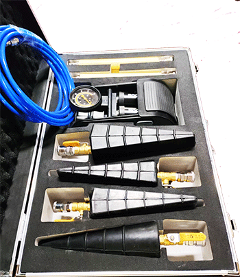 用于快速封堵背壓≦0.1Mpa,泄漏介質(zhì)溫度≦60℃的存儲(chǔ)罐、油罐車(chē)、液柜車(chē)裂縫,不需要拉伸帶。操作人員堵漏時(shí)將槍頭、槍桿、連接氣管、腳踏氣泵連接在一起,手持槍桿在安全距離外,將楔形或圓錐形密封袋插入于直徑15至60毫米的裂縫里面,以及直徑30至90毫米的漏孔內(nèi),并迅速充氣密封裂縫。
