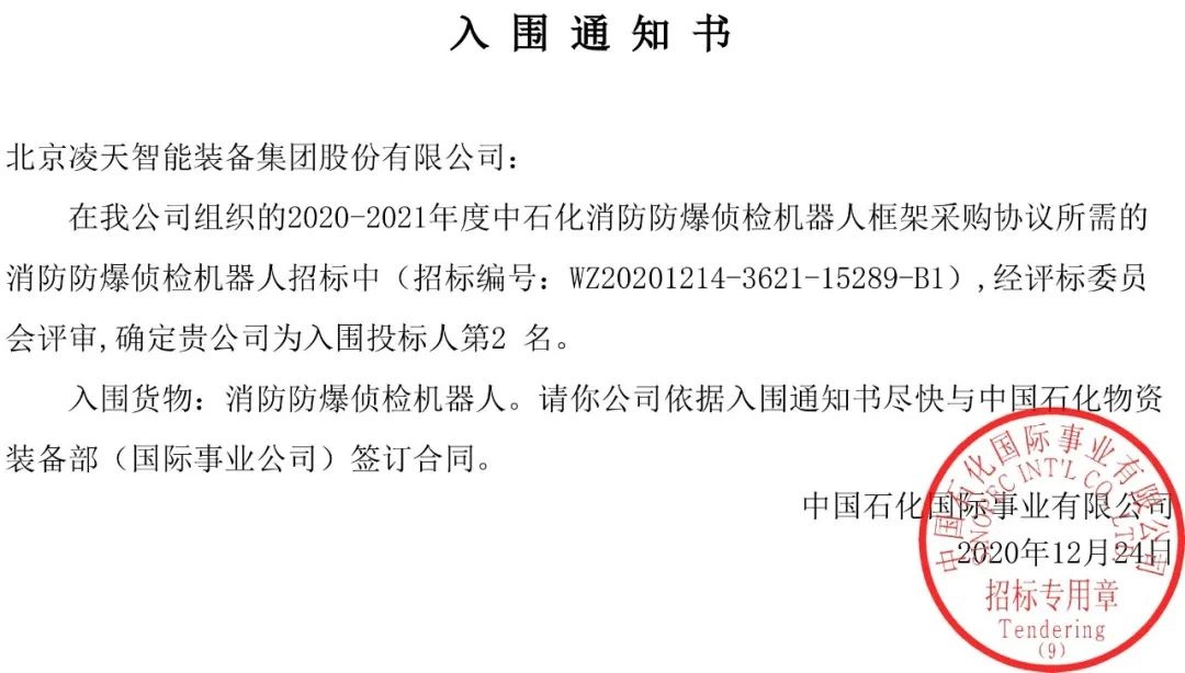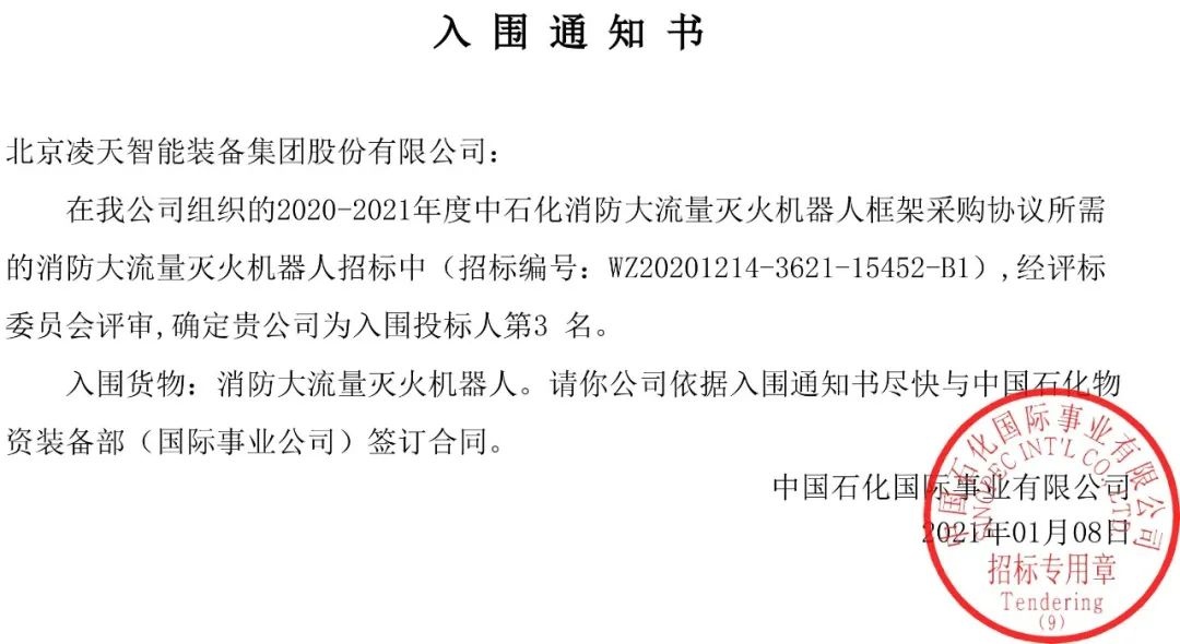 今日,從中石化天津國(guó)事了解到,北京凌天消防機(jī)器人全部中標(biāo)入圍中石化框架采購(gòu)目錄。