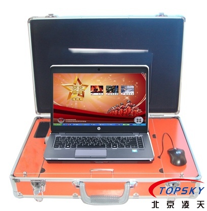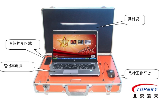開式手提箱結(jié)構(gòu),箱體上蓋部分為資料存放處,下箱體部分的上層為筆記本電腦操作平臺,右側(cè)為鼠標工作平臺,左側(cè)為音箱控制區(qū)域,下箱體的下層部分為一起設(shè)備存放區(qū)域;