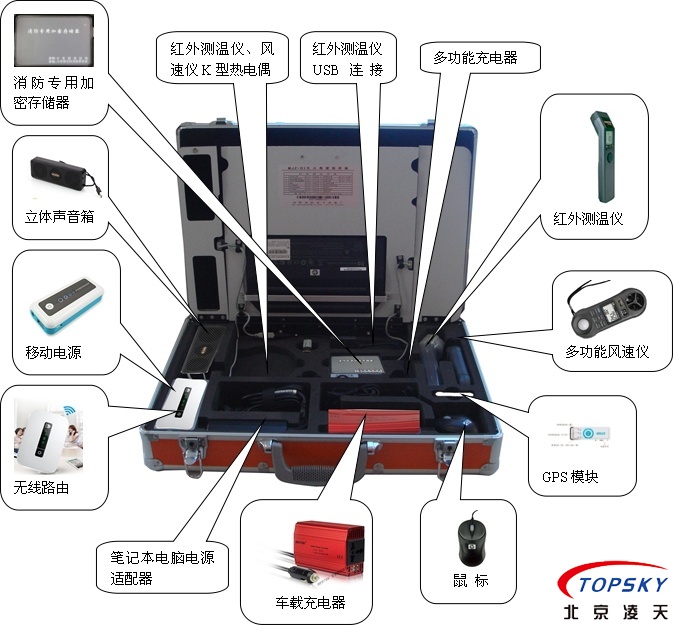 整套設(shè)備包括:筆記本電腦、紅外測溫儀、多功能風速儀、GPS模塊、消防專用加密存儲器、立體聲音箱、無線路由器、電源系統(tǒng)、鼠標、車載充電器、移動電源、筆記本電腦適配器、便攜箱、防水迷彩袋;