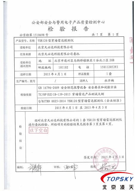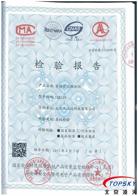 近日,北京天必達科技有限公司研發(fā)的YSR-120穿墻雷達探測儀通過公安部安全與電子產(chǎn)品檢測檢驗中心檢驗,檢測報告編號:公京檢第1510698號。
