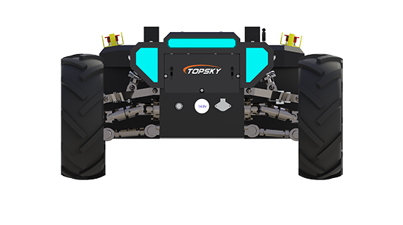 差速輪式機器人底盤采用鋰電池電源作為機器人動力源,使用無線遙控的方式遠距離操控機器人,并可定制復雜的操作模式,主控提供串口/標準CAN總線作為通訊接口。整機采用四輪獨立驅動、四輪差速轉向以及前后雙橫臂獨立懸架結構,具有IP65防塵防水能力,能夠在多種復雜環(huán)境運行。同時,整機采用模塊化設計,四獨立懸掛、左右電控箱及電池可快速拆卸維護更換??纱钶d多種設備從而代替人進行高效率作業(yè)。