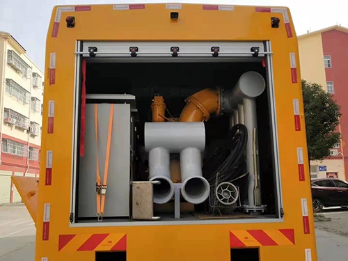 配備一臺(tái)一體式真空輔助自吸排污泵,流量1500m3/h,電機(jī)功率90kw,揚(yáng)程14m,吸程8m,安裝在車輛尾部,方便拆卸水管及出水。該泵無需灌水,無需額外增加水環(huán)泵輔助抽真空,性能好,出水快。水泵啟動(dòng)采用軟啟動(dòng)