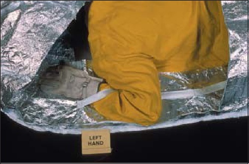 1)展開避火罩時,一定要用手臂和腿、腳固定住避火罩,這樣既可以防止避火罩被風(fēng)吹走,又可以隨時進(jìn)出避火罩內(nèi);